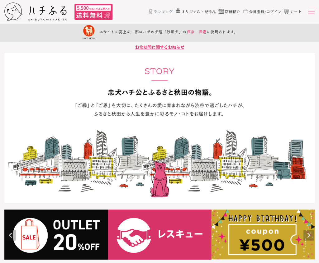 【PR】ハチふるSHIBUYAmeetsAKITA 忠犬ハチ公のふるさと秋田県の地方創生型オンラインショップをご紹介します。◆おすすめポイント◆・秋田県産の原材料を使用した商品が50種類以上!!・商品の売上の一部は「秋田犬」の保存・保護のために寄付されるそうです。・渋谷スクランブルスクエアにある地方創生型ショップで販売している商品が、渋谷に足を運ばなくてもオンラインでお気軽に購入できます。・税込5,500円以上のお買い上げで送料無料!・期間限定キャンペーンも随時開催中。◆こんな方におススメ◆秋田県産の商品や忠犬ハチ公に関心を持つ方地方創生に興味のある方◆商品の一例◆マスコット:980円(税込)渋谷ハチ公チーズサブレ:1,620円(税込)ハチ公ラーメン:324円(税込) 詳細はこちらをクリック おすすめ商品 マスコット 渋谷ハチ公チーズサブレ ハチ公ラーメン マスコット 980円(税込) 若者を中心に「キーホルダーが欲しい!」と多くの声が寄せられたことがキッカケで誕生したキーホルダーです。つぶらな瞳の愛くるしさと心地よい肌触りはそのままに、いつでも傍らにおけるサイズ感が特徴。お子様はもちろん、女性へのプレゼントにもオススメです。 渋谷ハチ公チーズサブレ6枚入り(個包装) 1,620円(税込) 忠犬ハチ公のふるさと・秋田県の美味しい素材を使用したスイーツです。香ばしいチーズの香りと、秋田県産米粉を使うことで生まれた軽やかな食感が特長。ほのかに甘いお米の後味と、香ばしいバターとチーズの香りがふわりと広がり、やわらかな口あたりが楽しめます。アーモンドのザクっとした食感がアクセントとなって、食べやすくも深みのある美味しさ。プレゼントや、お土産としてはもちろん、ご自分へのご褒美としてお取り寄せしてみてはいかがでしょうか。 ハチ公ラーメン 324円(税込) 秋田犬をモチーフにした醤油ラーメンです。パッケージの愛らしさとは裏腹に、秋田の有名地鶏「比内地鶏」の旨みが凝縮されたスープは本格的な味わい!つるつるシコシコの麺がよく合う1人前のスープ付き麺で、ご家庭でもお土産にもおすすめの一品です。 おすすめ情報 商材名 ハチふるSHIBUYAmeetsAKITA運営者 KY※当サイトはアフィリエイトプログラムを利用し宣伝目的で作成しております。