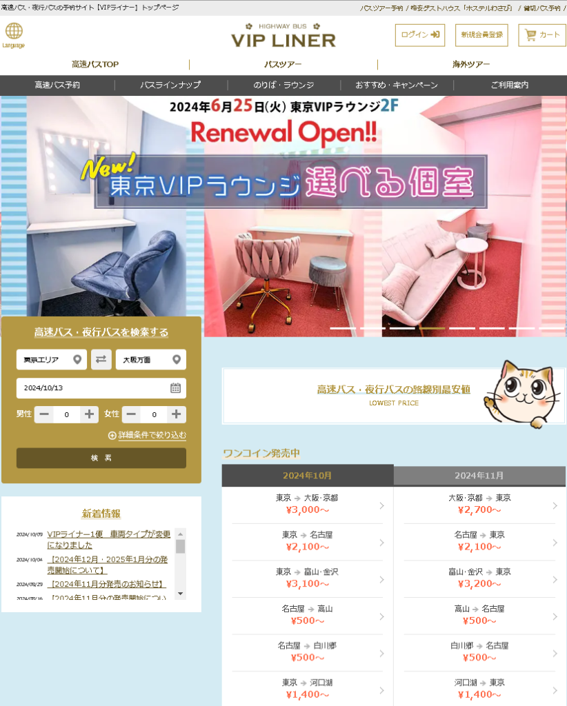 【PR】VIPライナー 夜行バス予約サイトのご紹介です。 東京⇔大阪・京都・名古屋間で毎日運行中。お隣席との仕切りカーテンや低反発シートを装備した3列シートをはじめとして、リーズナブルな4列スタンダードシートまでそろっていて、予算に合わせた選択ができます。 ■特徴■バスのタイプごとに用意されている設備には主に以下のようなものがあります。◇3列独立シート◇3列シート◇4列シート◇ランクアップシート◇トイレ付車両◇女性専用車両◇充電設備付車両◇Wi-Fi 搭載車両◇TVモニター付車両 ■運行へ備えた装備■以下のような装備で対応されているそうです。・衝突防止補助システムの全車導入・PCS(プリクラッシュセーフティ)・ドライブレコーダー設置・GPS搭載・デジタル式運航記録計(デジタコ)の導入・眠気検知センターの導入・乗務員の健康管理(定期健康診断・濫用薬物スクリーニング検査など) 詳細はこちらをクリック おすすめ商品 3列・電動バックシェルシート 3列・低反発シート 4列・楽のびシート 3列・電動バックシェルシート東京⇔京都・大阪・神戸 6,000円(税込)~ 全自動でリクライニングする3列独立タイプの席で、電動のバックシェルシートが採用されています。電動バックシェルシートは、前にスライドして倒れるため後部席の方へ気を遣わなくてもよいところがポイントです。また、前から倒れてこないため、足が挟まれる心配もありません。さらに3つの『全自動ボタン』で背もたれ・レッグレスト・フットレストを好みの位置に移動可能!体にフィットする位置にシートをカスタマイズできます。 3列・低反発シート東京⇔京都・大阪・神戸 6,000円(税込)~ 長時間の移動でも疲労が蓄積しにくい、低反発のダブルクッションエアリィソファが採用されています。体温に反応して柔らかくなる性質により体形にしっくり馴染み、低反発素材のシートが体重の圧力を吸収・分散して支えるので、長時間同じ姿勢で過ごしていても背骨や腰への負担が軽減されるそうです。 4列・楽のびシート東京⇔京都・大阪・神戸 4,300円(税込)~ 通常のスタンダードシートよりも前後との距離があり、足元がゆったりとしています。足元の広さを示す「シートピッチ」は、通常のシートが70~80㎝のところ、楽のびシートなら約90~118㎝と余裕があります。 おすすめ情報 商材名 VIPライナー運営者 K.Y※当サイトはアフィリエイトプログラムを利用し宣伝目的で作成しております。