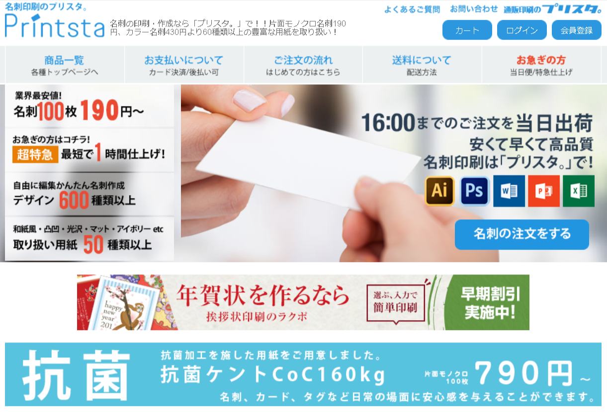 (PR)プリスタ。 詳細はこちらをクリック 名刺印刷サイトの紹介です。1.プリスタでは名刺印刷が100枚190円〜にて印刷可能です。2.最短当日発送3.大阪市内であれば当日中のお届けも可能4.豊富な用紙で高品質「名刺 印刷」「名刺 作成」などのキーワードを盛り込んだ内容にて安さ・早さをアピールできる内容でご紹介をお願い致します。現在の客単価は約4,000円です。 【※当ページはリンク先から情報を引用しています※】