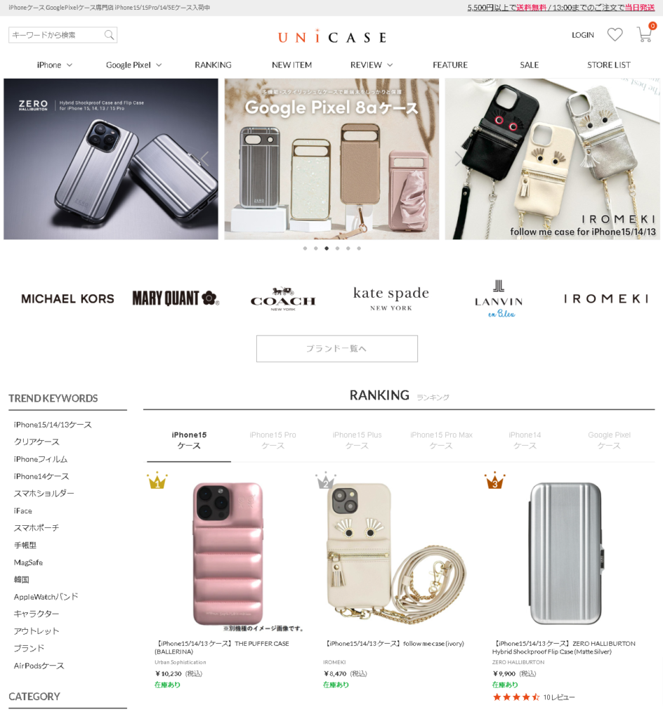 【PR】UNiCASE ユニケース 詳細はこちらをクリック iPhoneケース等を豊富に取り揃えられているスマートフォンアクセサリーのご紹介です。かわいいiPhoneケース、珍しいiPhoneケース、その他限定のスマートフォンアクセサリー、アプリとスマートフォン連携グッズ、Bluetooth対応のイヤホン・スピーカーなど1,000を超えるメーカー・60,000種類以上の商品が取り揃えられています。人気の手帳型ケースのほか、iPhoneのデザインを楽しめるクリアケース、ビジネスシーンに合うレザーケース、かわいいケースも充実!限定アイテムも購入できます。在庫ありの商品は、13:00までのご注文で当日に発送します!※日・祝・後払い除くクレジット決済の承認・確認が取れなかった場合、ご注文時に備考欄でのお問い合わせを頂いた場合など、当日発送が出来ない場合があります。また、ご注文が集中した場合、システムに障害が有った場合には当日発送の対象外となる事があります。■5,400円以上のご購入で送料無料!現在、お届け先1件につき税込5,400円以上で送料無料!※ご注文1件ごとのご注文合計金額になります。複数商品同時購入時に、ある商品がキャンセル(理由を問わず)となり、ご注文合計金額が送料無料の条件を下回った場合、送料が発生いたします。 おすすめ商品 【iPhone15/14/13 ケース】THE PUFFER CASE (BALLERINA) ¥10,230(税込) 見た目のかわいらしさだけでなく、大切なスマホをしっかり保護してくれる機能性とデザイン性を兼ね備えたスタイリッシュなiPhoneケースです。 【iPhone15/14/13 ケース】ZERO HALLIBURTON Hybrid Shockproof Flip Case (Matte Silver) ¥9,900(税込) マグネットでスムーズに閉じられるフリップには便利なカードポケットがついているのでICカードなどを1枚収納できます。米軍軍事規格の落下テストをクリアした、頑丈で衝撃に強い耐久性に優れたiPhoneケースです。 おすすめ情報 ※当ページはリンク先から情報を引用しています