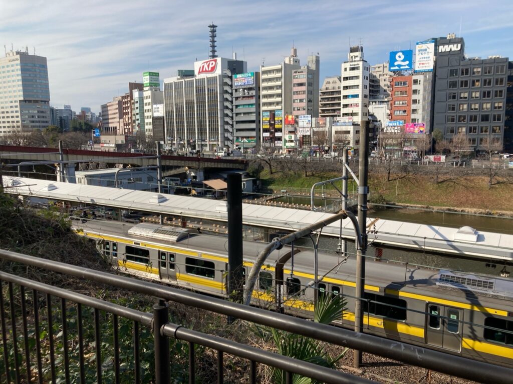 市ヶ谷にて 研修で市ヶ谷に行きました。地下鉄を出てすぐに電車と川が見えるスペースがあって、昼時ともなれば近所の会社勤めの方やお買い物途中の方が休んでいく憩いの場所となっています。このスペースの目の前にはコワーキングスペースがあって、研修までの空き時間をそこで過ごしました。プライバシーに配慮された個室風のブースと電源にフリードリンクがついたプランで、快適に過ごせました。