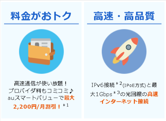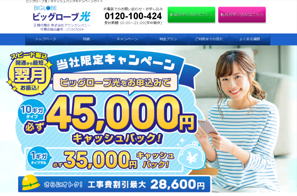 【PR】ビッグローブ光 光インターネット回線のプロバイダーが展開しているキャンペーンのご紹介です。国内主要通信事業者の光回線「フレッツ光」サービスを速度・品質を変えずに提供しています。すでにフレッツ光をご利用の場合は立会い工事が不要。ネットだけでもキャッシュバック 45,000 円!新規お申込みの方で、指定オプションも同時加入なら最大 53,000 円ものキャッシュバックがもらえる超お得なキャンペーン!さらに新規お申込み時の工事費も割引に!料金プランの一例【ファミリータイプ月額利用料】3年プラン(定期利用期間36カ月) 5,478円2年プラン(定期利用期間24カ月) 5,698円【マンションタイプ月額利用料】3年プラン(定期利用期間36カ月) 4,378円2年プラン(定期利用期間24カ月) 4,488円※東日本エリアでギガビットに対応したWi-Fiルータ(1ギガ対応無線LANルータ)をレンタルでご利用される場合、別途機器利用料550円/月がかかります。 詳細はこちらをクリック おすすめポイント 高速・高品質 高速通信 IPv6接続(IPoE方式) 最大1Gbpsの光回線 高速・高品質 国内主要通信事業者から光回線を借り受けて提供する光アクセスサービスのため、フレッツ光と回線品質は同じ!さらに様々なサービスもオプションで用意されています。 ※イメージ 高速通信 IPv6接続 (IPoE方式) 現在よく使われているネットワーク(PPPoE方式)は、通信量増加により夜間に混雑しがちです。それに比べてIPv6接続(IPoE方式)を利用するため速度低下がありません。 最大1Gbpsの光回線 国内主要通信事業者の光回線を使用しているため、サービス提供エリアおよび回線品質がフレッツ光と同じです。 利用された方のクチコミ 皆さん、ご丁寧で親切に対応していただけました。現金よりも商品券が良かったので、同額のキャッシュバックを商品券で受け取れることができて嬉しかったです。ありがとうございました。キャンペーンの内容のことはもちろん、Wi-Fiの接続の仕方などの申し込み手続きとは関係ないことにも丁寧に説明していただけてとても親切でした。開通までの注意点も説明していただき、スムーズに対応していただけました。 おすすめ情報 ※当ページはリンク先から情報を引用しています
