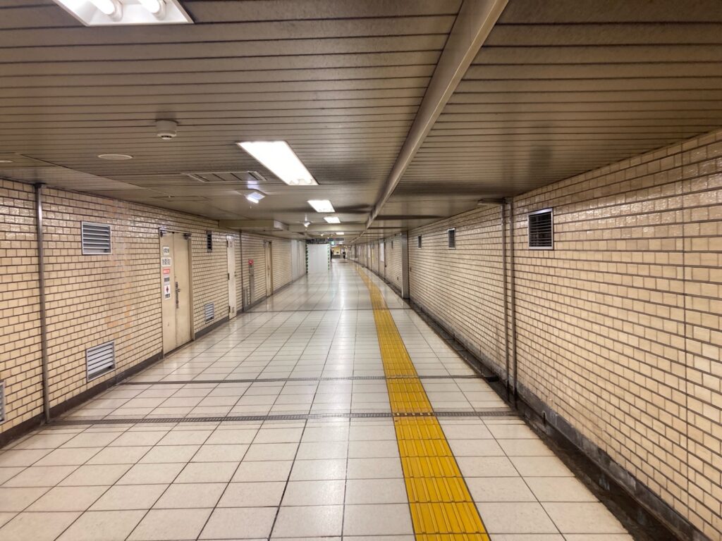 都会の地下 都会に引っ越してきた頃は、地下の広がりにびっくりしていたものです。丸の内線って書いてある入口から入っても、丸の内線ホームに行きつくまでには千代田線とか日比谷線とかのホームを経てたどり着くことになることもあり、その複雑さには今でも驚かされます。普段は通勤客で込み合う地下通路も、こんな風にがらんとしてると新鮮ですね。